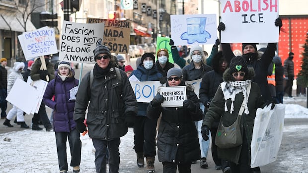 Demonstrators gathered in Montreal on Sunday to protest the immigration crackdown by U.S. Immigration and Customs Enforcement, calling out the law enforcement agency’s tactics as well as Canadian “complicity” in them.
